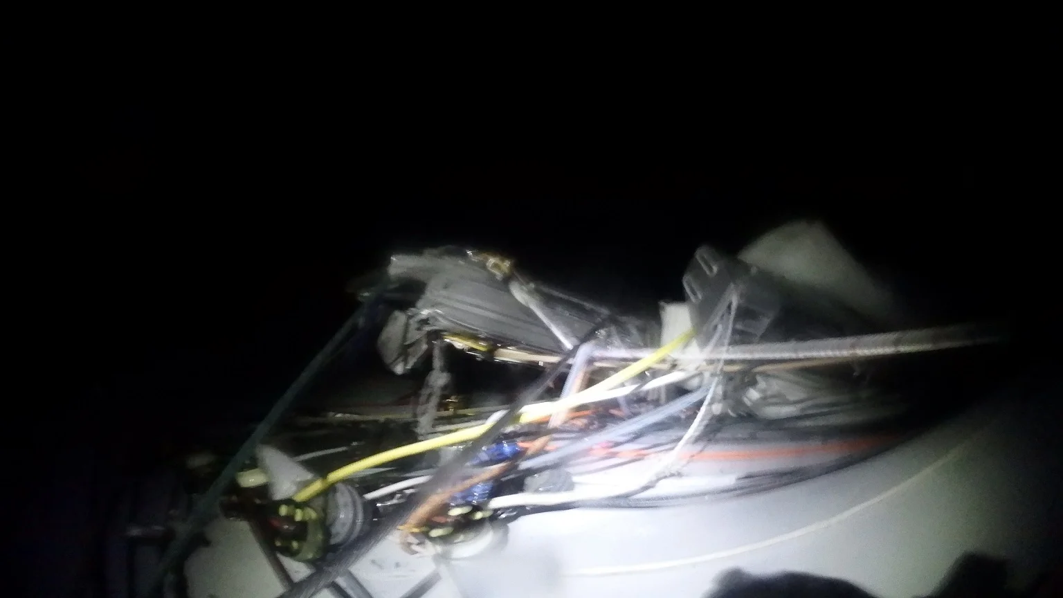 I decided that I needed to add more ropes to it first as I really didn’t want to lose the boat if the mast went over the side. I also needed to call Jeff again and let him know that I was safely back inside what was left of the rails and that the forestay was now free. I added a few more bits of rope to the bottom of the mast to give me some time to come up with another plan and called Jeff. In that conversation, I just updated him on how I was going and about my problem of the shrouds. He also asked if the boom was salvageable for a jury rig. I immediately said no, but then once I thought about it there was a slight chance that I could save it. I still had no options for getting the starboard shrouds free but was thinking along the lines of letting the mast go by releasing the last of the wires and ropes and then hope that the mast would sink or move sideways so it wouldn't put a hole in the hull while I was freeing the starboard shrouds... It wasn’t a good plan but it was a plan.