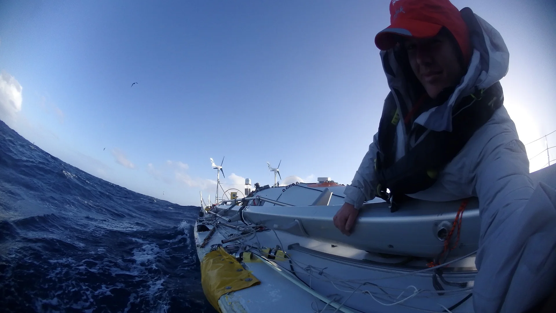 Understanding that this was really risky but necessary, I decided to go below and give Jeff another call. I was also freezing by this stage and my Beanie was soaked and the water kept getting down my neck so I wanted to add a few layers. I called Jeff and told him what I was about to do and that I have managed to free both the back stay and the inner forestay. Going onto the prodder in these conditions was really dangerous. I told him that I have my PLB on my life jacket, so if that is triggered you know that I have gone overboard. He acknowledged that all was understood and I bolted back on deck again. The railings were unreliable and the starboard side was a mangled mess from the mast landing on it so I was mostly crawling and bum shuffling around on the deck. I was keeping tethered to anything I could find that would work. My port side jackstay survived so I used that mostly.