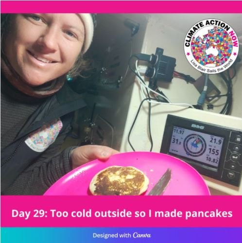 The rest of my day was fairly normal, and the winds maintained around 25 knots for the majority of it. I changed the micro plastic filters over and got a little creative in the galley (kitchen) and decided that I would have pancakes for dinner... I am a grown women so I can totally have pancakes for dinner, right? Well, I did, but it was a little entertaining when the winds built above 35 knots and we started to broach and roll over so much that I needed to try and catch all the items on the countertop as we did... It made for an entertaining dinner to say the least.